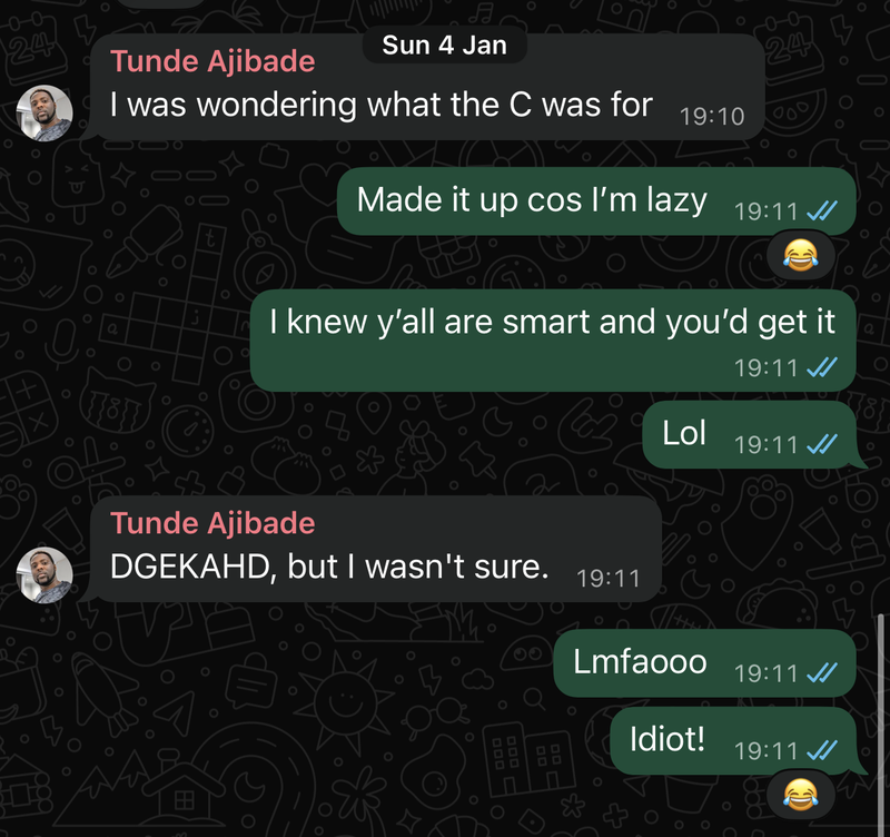 Trash Acronyms: I blame acronyms for what happened. Who knows, the sentiments might have been less intense and unrelated events might not have been strung together if I had just said "customer specific plans". That reminds me of a funny chat on my group chat with my siblings. I had made a statement starting with an acronym I expected them to figure out and my brother responded with an acronym no one has figured out till today. The utter ridiculousness 😂