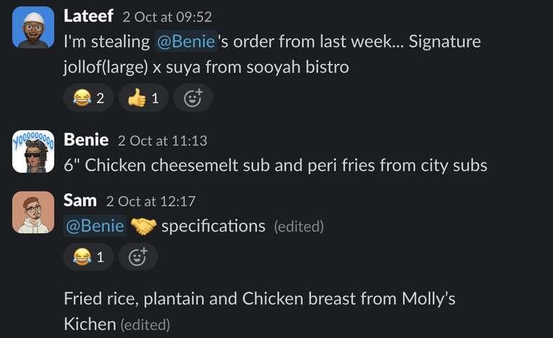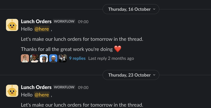 Every Thursday, a workflow runs on our #lunch-orders channel. Everyone gets to order what they want delivered to them for lunch the next day.