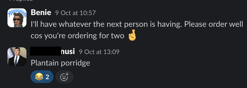 When I created our Slack workspace, I set my display photo as an avatar. It was deliberate: I wanted the āWeāre professional, but we donāt do stiff or overly formal hereā kind of vibe. For me, it was important to build a culture where people didnāt feel the need to be too official. I wanted us to focus on the most important thing, which was building stuff, without sacrificing the fun along the way.